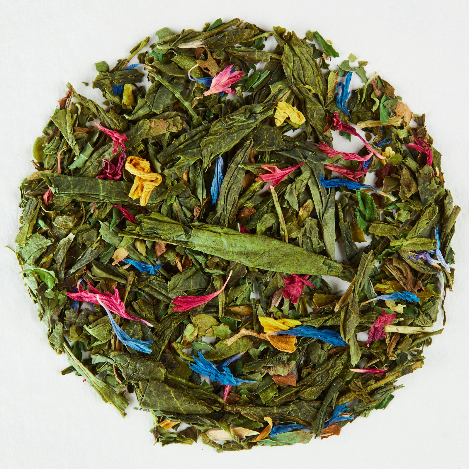 Kompozycja: chińska zielona herbata, liście mięty pieprzowej, liście moringi, liście mięty zielonej, płatki słoneczników oraz niebieskich i czerwonych chabrów.