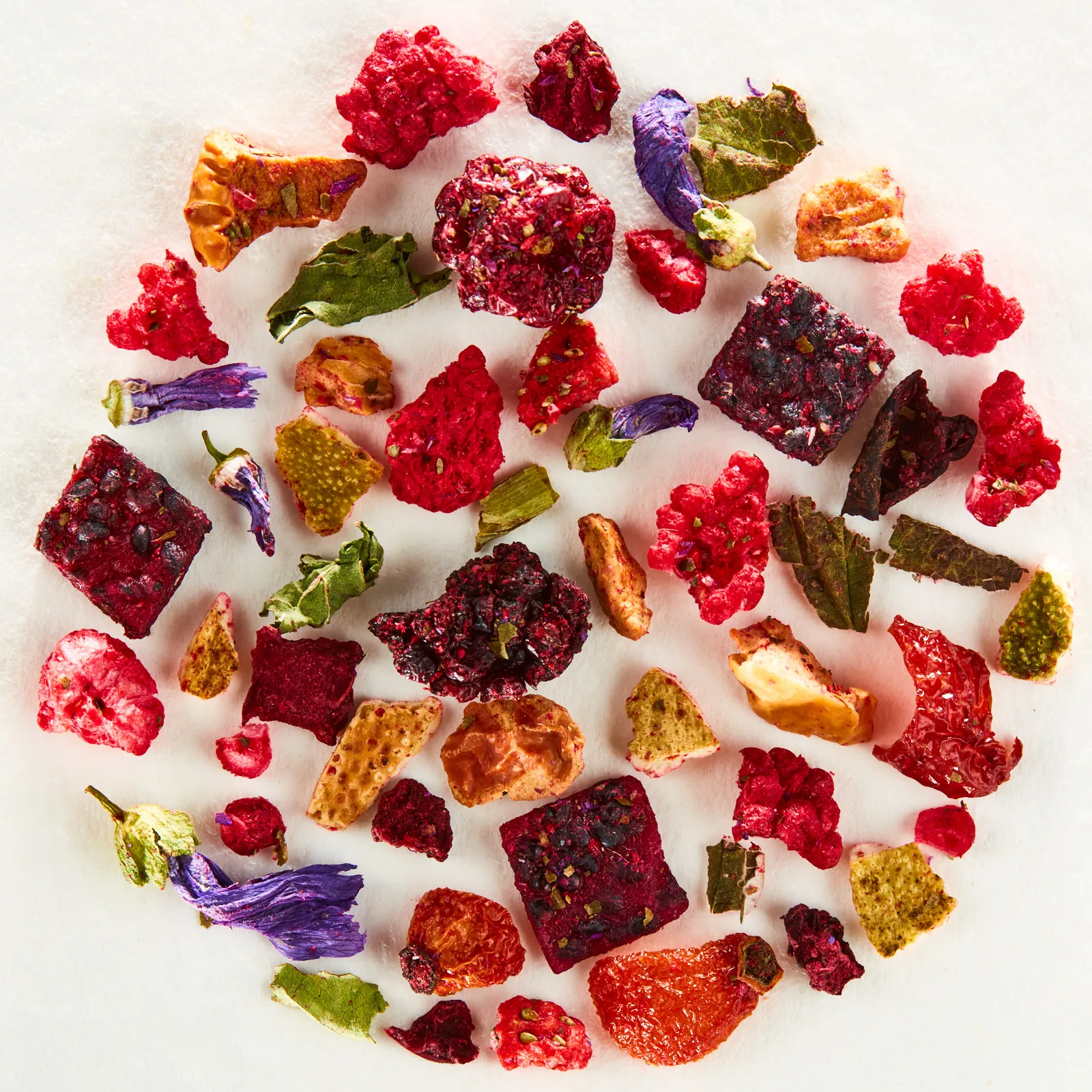 kawałki pieczonych jabłek, kawałki liofilizowanych malin, smoczy owoc (smoczy owoc pokryty mąka ryżową zapobiegającą sklejaniu się kawałeczków owoców), skórka dzikiej róży, słodkie liście jeżyn, burak, skórka cytryny, aromat, liofilizowane truskawki, fioletowe płatki malwy, liofilizowane jeżyny, organiczne liście malin.