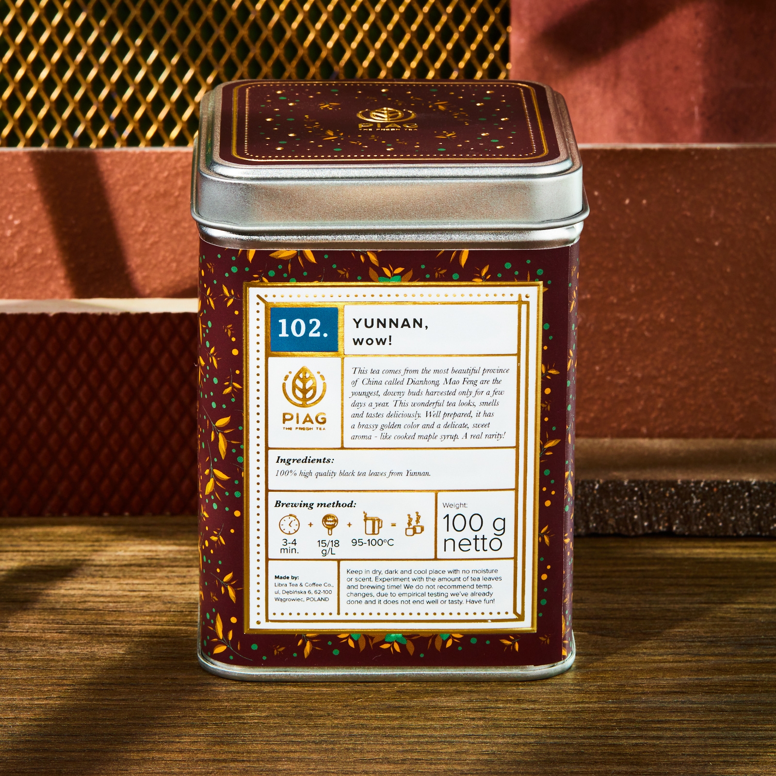 Taste: From the very first infusion, you’ll discover a rich, mellow sweetness with a hint of pleasant bitterness and a delicate floral finish. The golden tips – the precious leaf buds – give the tea its distinctive character and a stunning amber color. The aroma of Yunnan Wow! by Piag Tea is fresh and floral, with bright citrus and subtle honey notes.