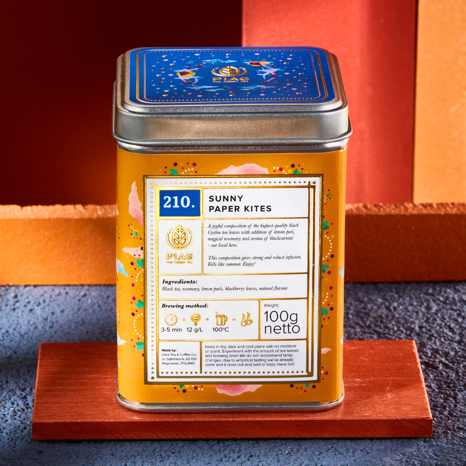 Packaging: Sunny Paper Kites from Piag Tea comes in an elegant tin that will decorate any kitchen. A beautiful design by illustrator and designer Katarzyna Korzeniowska. Each tin is hand-wrapped and packed. Everything we do – we do with love.
