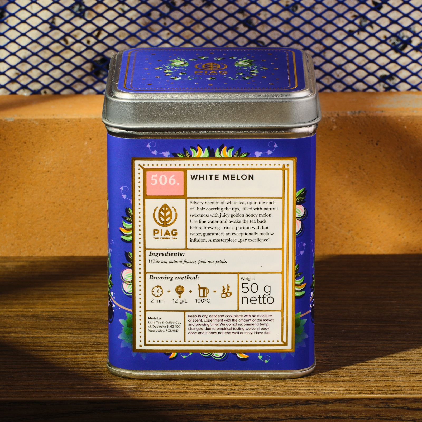 Packaging: White Melon Piag Tea comes in an elegant tin that will beautifully adorn any kitchen. The exquisite design is the work of illustrator and designer Katarzyna Korzeniowska. Each tin is hand-labeled and hand-packed. Everything we do – we do with love.