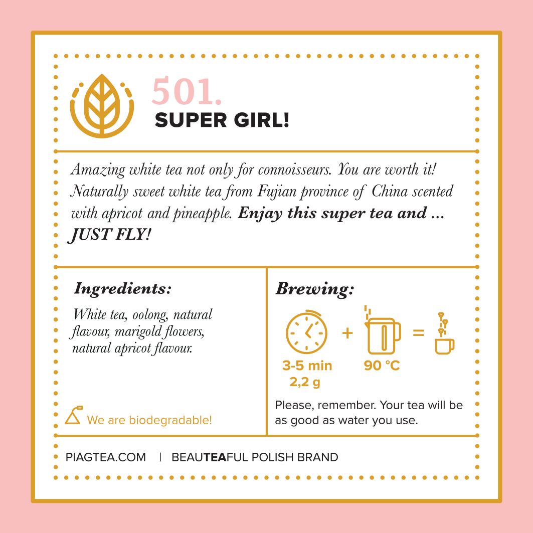 Packaging: Piag Tea’s Super Girl comes in an elegant tin that will brighten any kitchen. Designed by illustrator and designer Katarzyna Korzeniowska, each tin is carefully wrapped and packed by hand. Everything we do – we do with love.