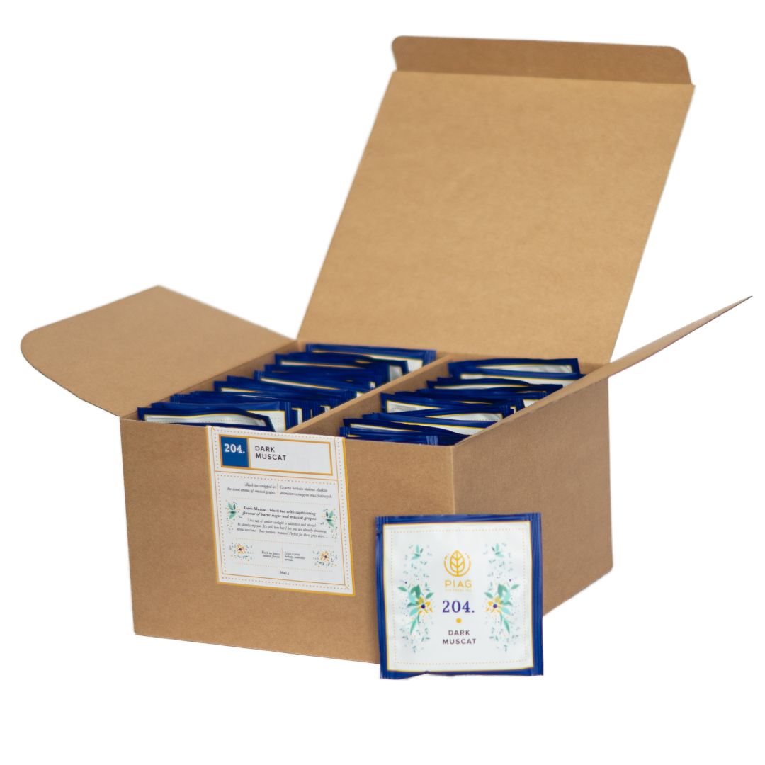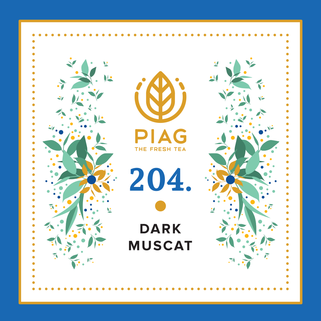 At the heart of Dark Muscat Piag Tea lies carefully selected black tea. Each leaf is a little treasure, hand-picked on the best plantations, where the bushes ripen under the sun before being processed with precision. Then comes the touch of summer’s sweetest kiss – the Muscat grape. Famous for its honeyed taste and floral notes, it blends seamlessly with tea, creating a composition that seduces the senses and sparks the imagination.