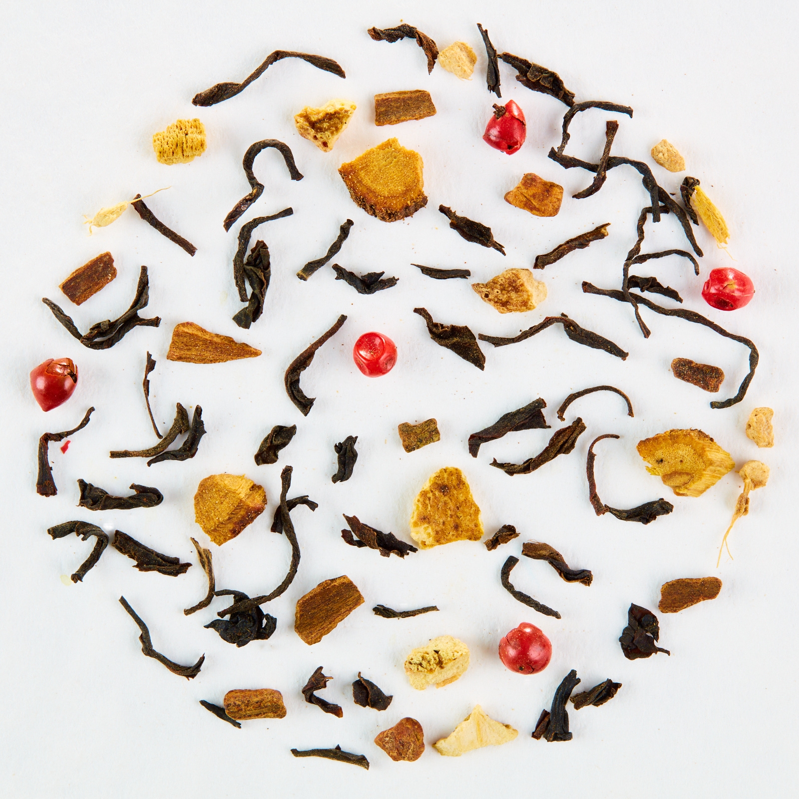 Liście herbat Assam, cynamon, imbir, pieprz, kardamon, skórka pomarańczy, goździki, naturalny aromat pomarańczowo – korzenny.