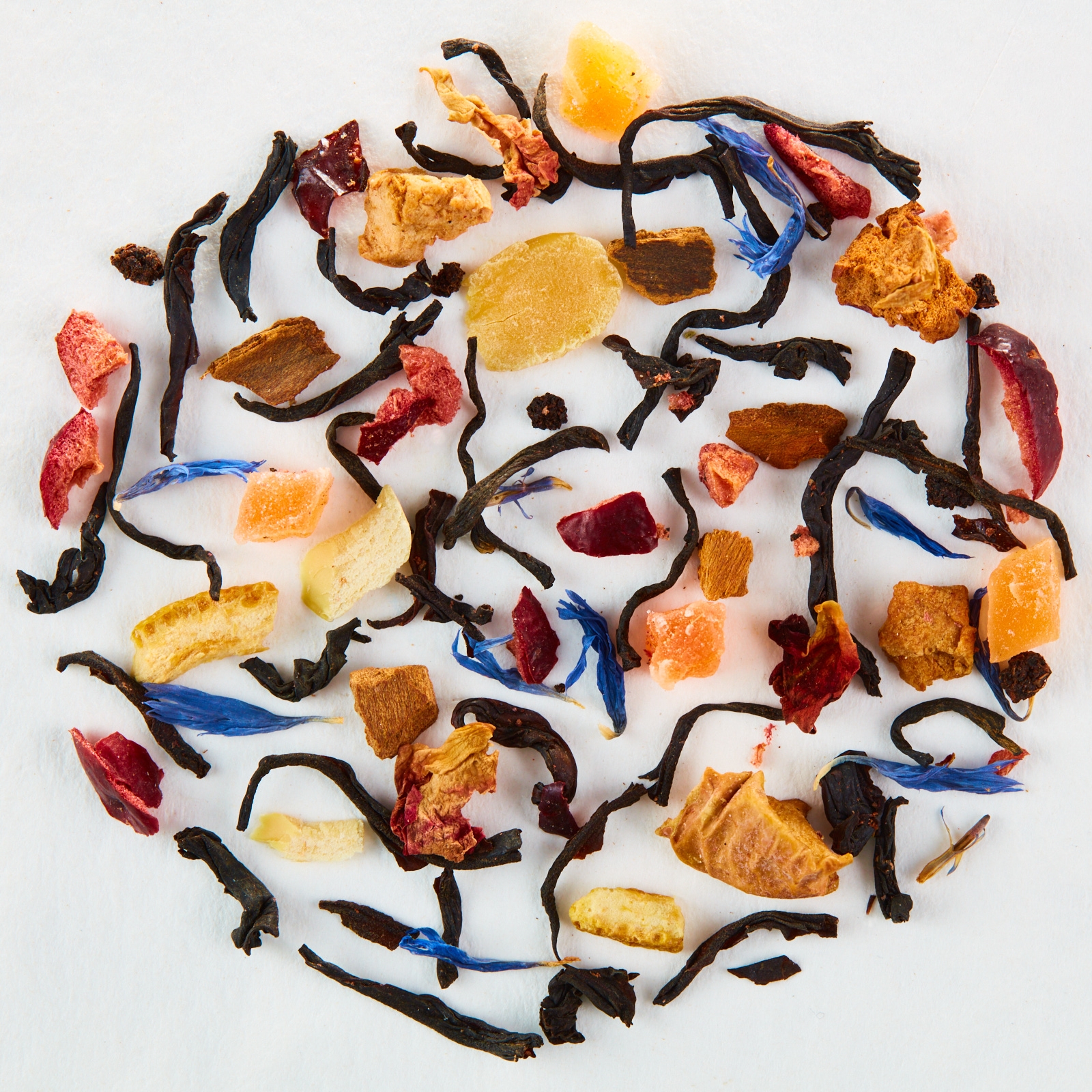 Czarna herbata, kandyzowana papaja, kawałki żurawiny, kawałki jabłka, naturalny aromat, cynamon, posiekane migdały, owoce dzikiej róży, czerwone płatki róż, niebieskie płatki chabrów.