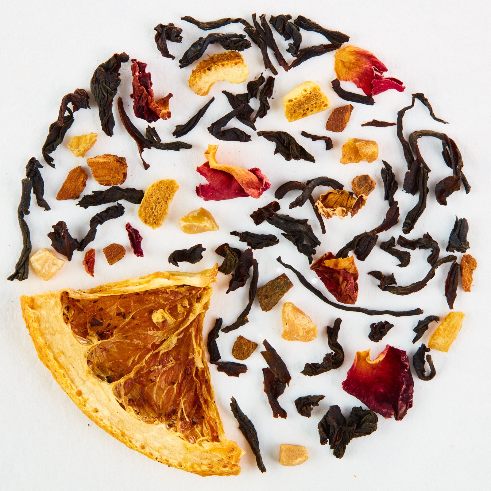 Kompozycja: czarna herbata, skórka pomarańczy, kawałki pomarańczy i wanilii, cynamon, posiekane migdały, goździki, kardamon, płatki róży.