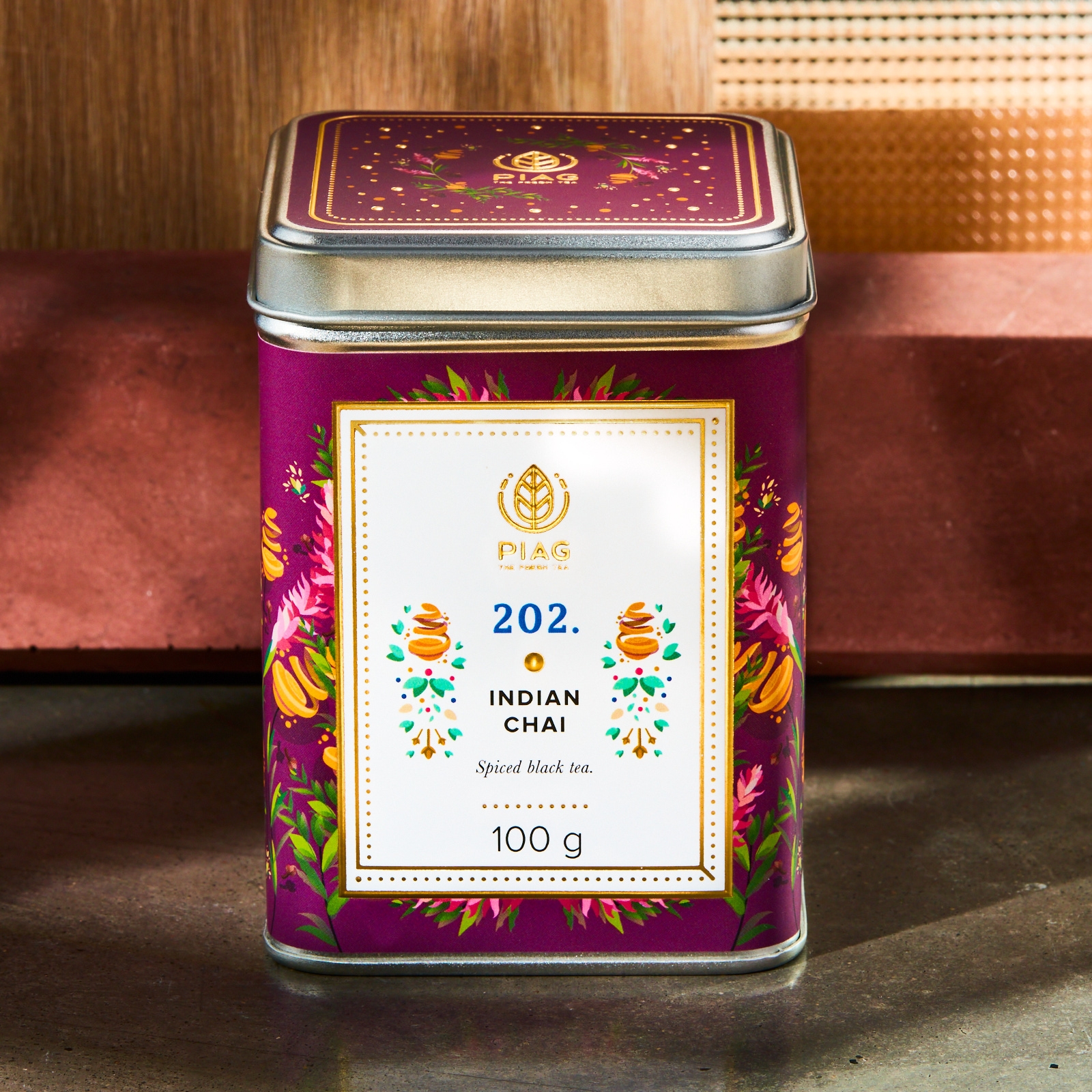 Opakowanie: Herbata Indian Chai od Piag Tea zapakowana jest w elegancką puszkę, która ozdobi każdą kuchnię. Wspaniały design autorstwa ilustratorki i projektantki - Katarzyny Korzeniowskiej. Każda puszka oklejana i pakowana jest ręcznie. Wszystko, co robimy - robimy z miłością.