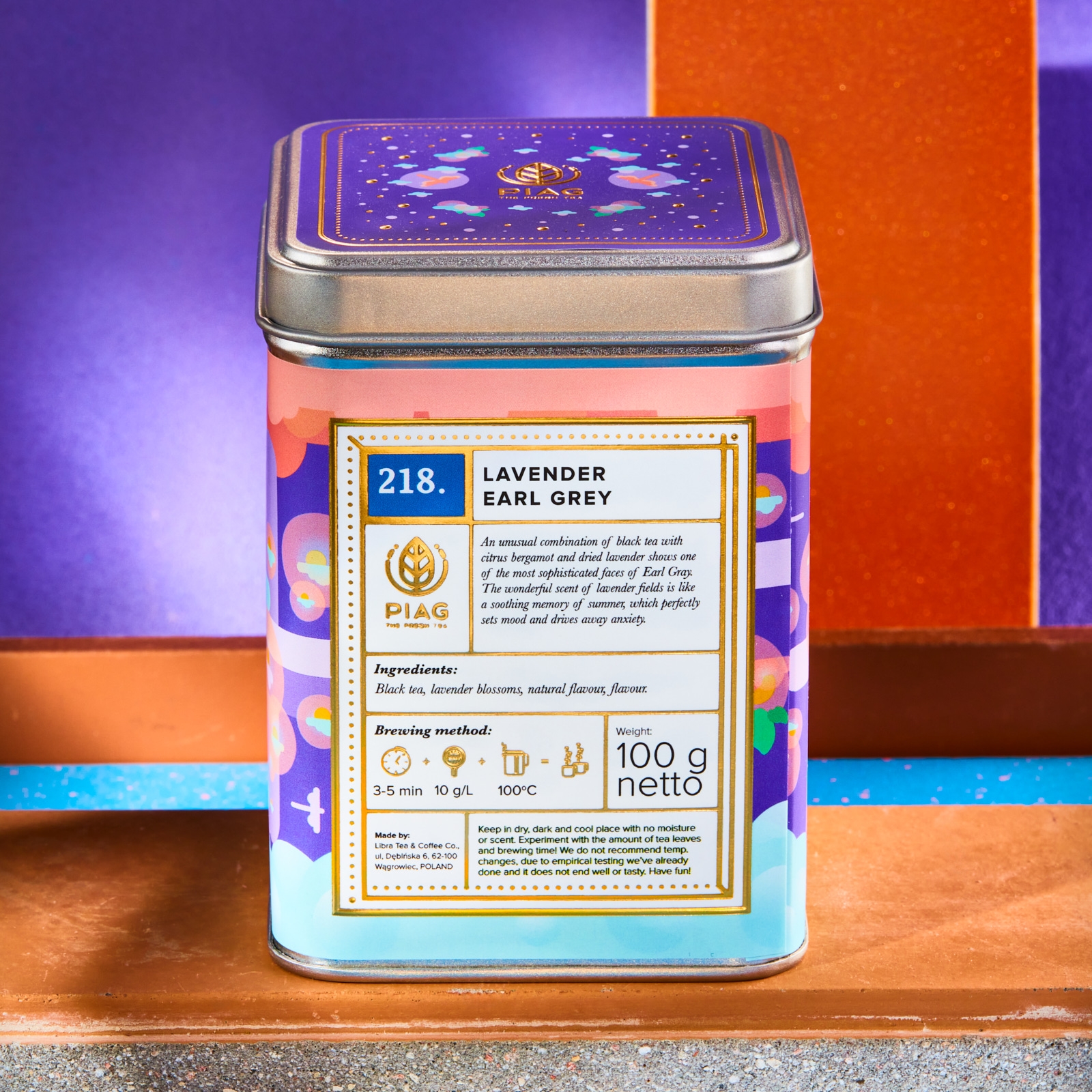 Opakowanie: Herbata Lavender Earl Grey od Piag Tea zapakowana jest w elegancką puszkę, która ozdobi każdą kuchnię. Wspaniały design autorstwa ilustratorki i projektantki - Katarzyny Korzeniowskiej. Każda puszka oklejana i pakowana jest ręcznie. Wszystko, co robimy - robimy z miłością.