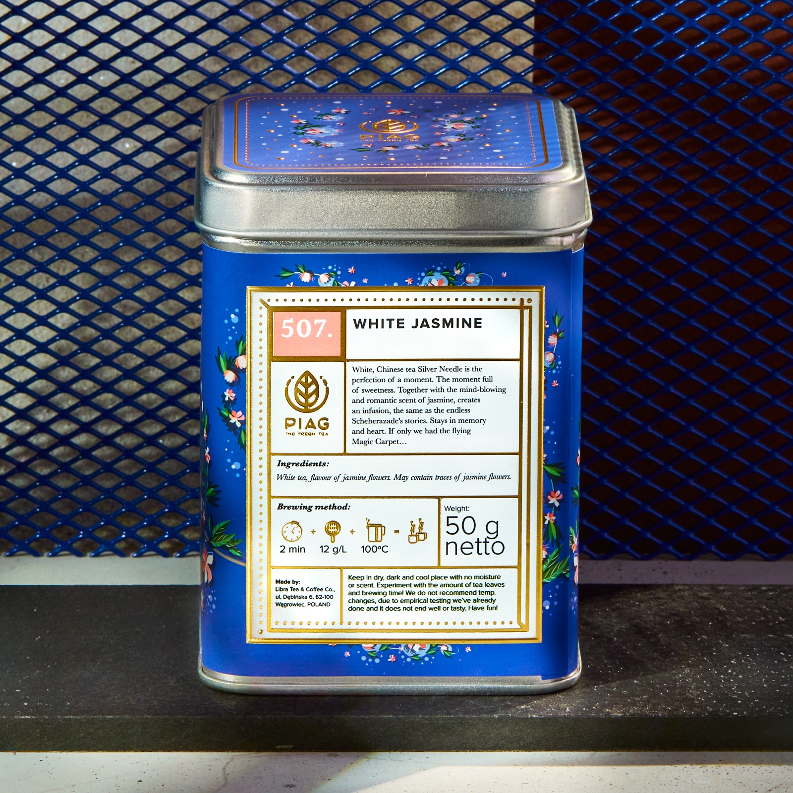 Opakowanie: Herbata White Jasmine Piag Tea zapakowana jest w elegancką puszkę, która ozdobi każdą kuchnię. Wspaniały design autorstwa ilustratorki i projektantki - Katarzyny Korzeniowskiej. Każda puszka oklejana i pakowana jest ręcznie. Wszystko, co robimy - robimy z miłością.