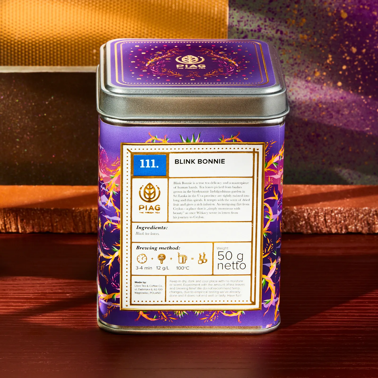 Opakowanie: Herbata Blink Bonnie od Piag Tea zapakowana jest w elegancką puszkę, która ozdobi każdą kuchnię. Wspaniały design autorstwa ilustratorki i projektantki - Katarzyny Korzeniowskiej. Każda puszka oklejana i pakowana jest ręcznie. Wszystko, co robimy - robimy z miłością.