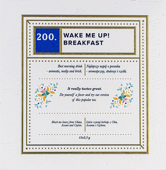 Smak: Wake me up! Breakfast tradycyjnie podawana jest rano, często do śniadania. Anglicy od wieków cenią sobie ten rodzaj herbaty. Jest mocna i aromatyczna, idealna na dobry początek dnia. Pije się ją zazwyczaj z mlekiem i cukrem.