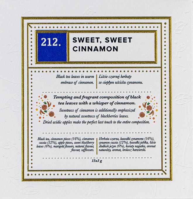 Kusząca i wonna kompozycja liści czarnej herbaty z cynamonowym szeptem. Słodycz cynamonu dodatkowo podkreślają liście słodkiej jeżyny, zawierające naturalną substancję słodzącą – naturalny słodzik zwany rubusozydem, który jest 200 razy słodszy niż cukier trzcinowy. Dodatek suszonych, kwaskowych jabłek doskonale równoważy słodycz, a całość rozświetlają miedziano żółte płatki kwiatów.
