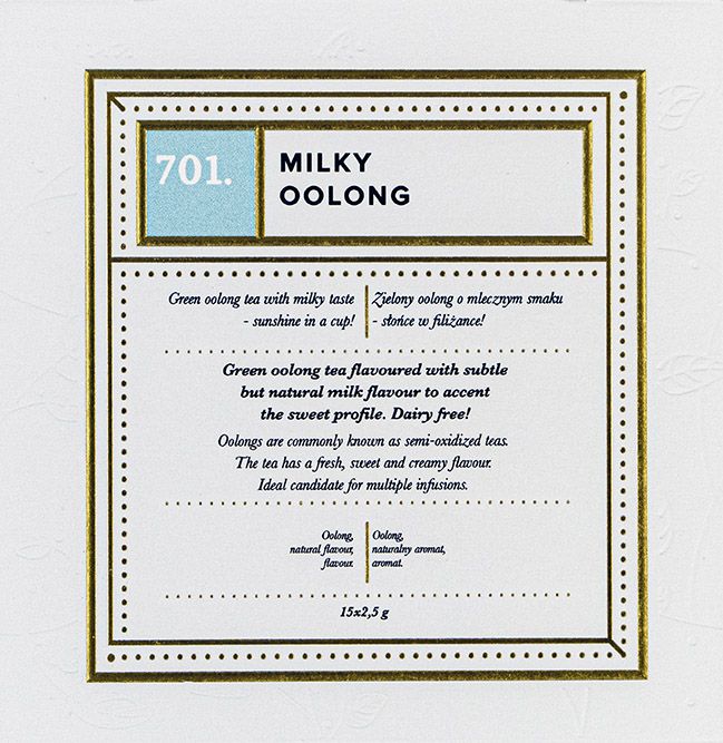 Milky Oolong to lekko utleniony oolong a otrzymany napar podobny jest do zielonej herbaty z taką jednak różnicą, że liście mogą być zaparzane kilkukrotnie za każdym razem pokazując ciut inne oblicze. Potrafi zaskoczyć swym maślano waniliowym posmakiem a drugim razem wywoła uśmiech na twarzy słodko kremowymi nutami. Nie zawiera laktozy.