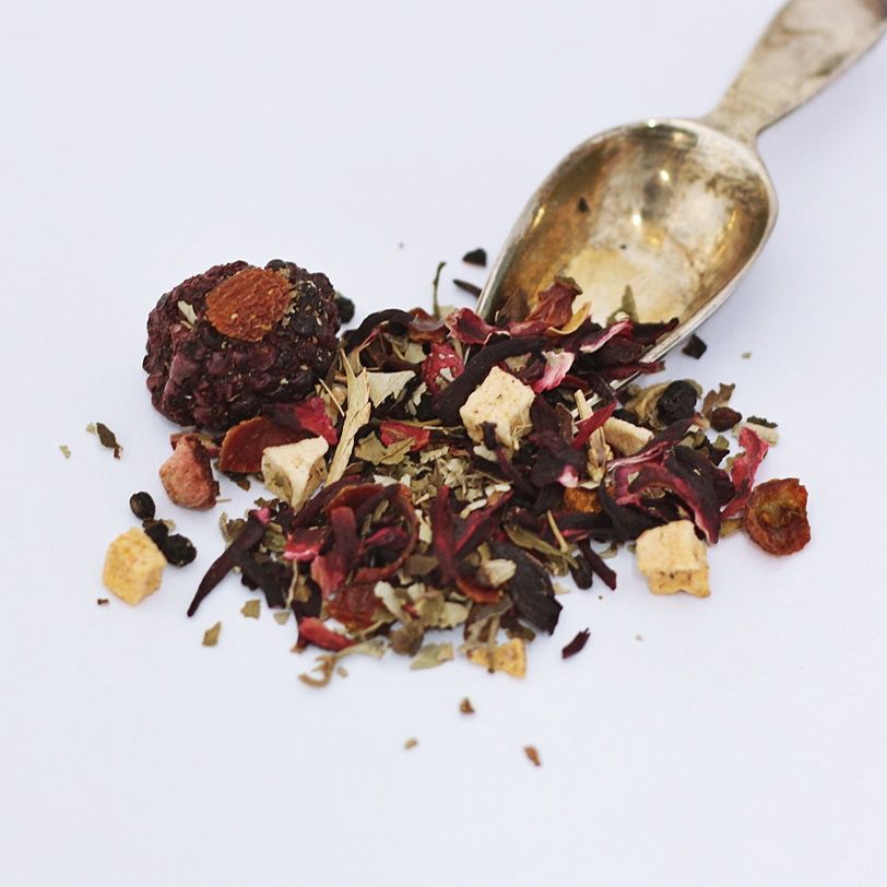 Hibiskus nadaje herbatce intensywny, czerwony kolor i kwaskowaty posmak, który pobudza zmysły i orzeźwia. Jest bogaty w witaminę C, antyoksydanty i flawonoidy, które wspomagają układ odpornościowy, krążenia i trawienia. Kosteczki suszonego jabłka dodają herbatce słodyczy i chrupkości, a także zawierają pektynę, która reguluje poziom cholesterolu i cukru we krwi. Czarny bez jest źródłem witamin A, B i C, a także kwasu foliowego, żelaza i potasu. Ma działanie przeciwzapalne, przeciwwirusowe i przeciwbakteryjne, a także łagodzi objawy przeziębienia i grypy. Dzika róża jest znana ze swojego wysokiego stężenia witaminy C, która wzmacnia odporność i poprawia stan skóry, włosów i paznokci. Liście i owoce jeżyny są bogate w witaminy A, C, E i K, a także w błonnik, magnez i wapń. Mają właściwości przeciwutleniające, przeciwzapalne i przeciwbiegunkowe, a także wspierają zdrowie jamy ustnej i dziąseł. Maliny są źródłem witamin C, E i K, a także kwasu foliowego, żelaza i manganu. Mają działanie przeciwutleniające, przeciwnowotworowe i przeciwcukrzycowe, a także poprawiają nastrój i samopoczucie. Czarne porzeczki są jednymi z najbogatszych w witaminę C owoców, a także zawierają witaminy A, B i E, a także żelazo, magnez i cynk. Mają działanie przeciwzapalne, przeciwalergiczne i przeciwanemiczne, a także wspomagają wzrok i pamięć. Suszone kawałki truskawek nadają herbatce słodkiego i orzeźwiającego aromatu, a także są źródłem witaminy C, kwasu foliowego i potasu. Mają właściwości przeciwutleniające, przeciwnowotworowe i oczyszczające, a także poprawiają stan zębów i dziąseł.